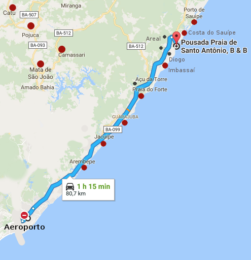 SAINDO DO AEROPORTO: Você tem que chegar a um Ponto de Ônibus na Estrada do Côco. Lá você deve tomar um ônibus em direção a Porto de Sauípe e saltar em Praia do Forte. Chegando lá tomar um táxi para a Vila ou tomar uma van em um dos 3 horários disponíveis.